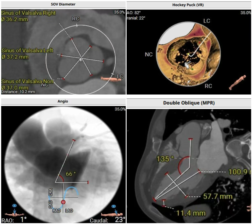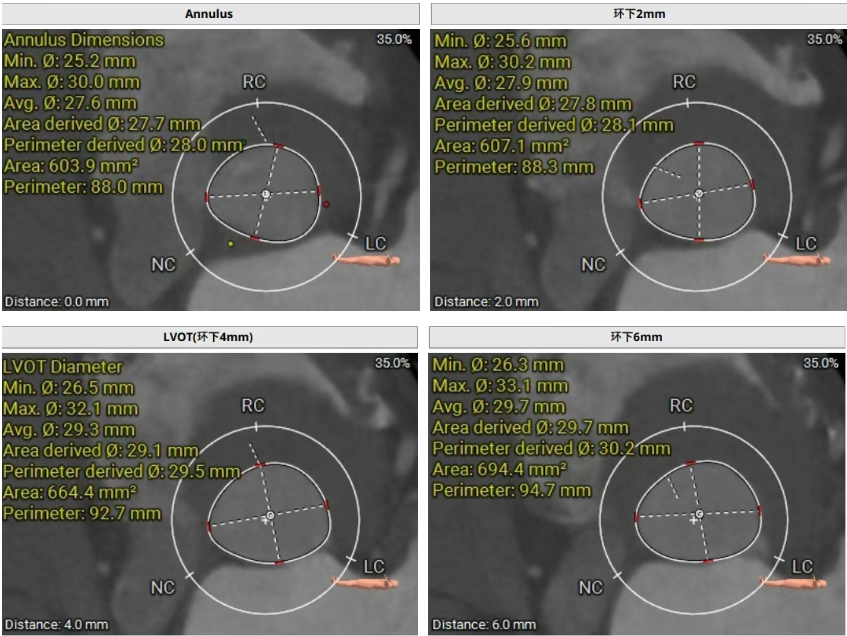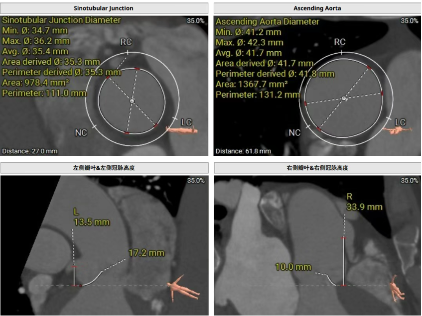 術前CT評估提示,患者主動脈瓣為三葉瓣,瓣葉增厚。舒張期可見右冠瓣脫垂,右冠瓣瓣葉輕度鈣化。存在三個瓣竇,分佈較為均勻。主動脈瓣環周長折算直徑為28.0 mm;左心室流出道(LVOT)周長折算直徑為29.5 mm,未見鈣化及狹窄。主動脈竇管交界(STJ)直徑為35.3 mm,升主動脈直徑為41.8 mm。冠狀動脈開口高度如下:左冠狀動脈(LCA)13.5 mm,瓣葉長度17.2 mm;右冠狀動脈(RCA)33.9 mm,瓣葉長度10.0 mm。左側冠狀動脈見輕度鈣化。心臟呈橫位心,左心室與主動脈夾角為135°。